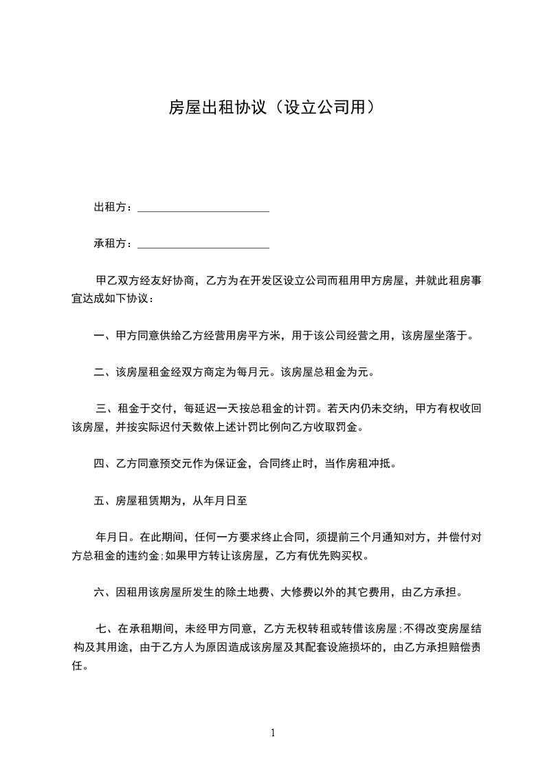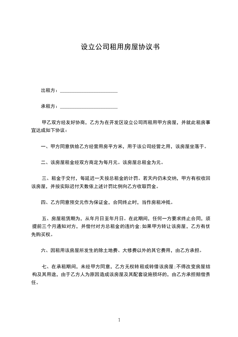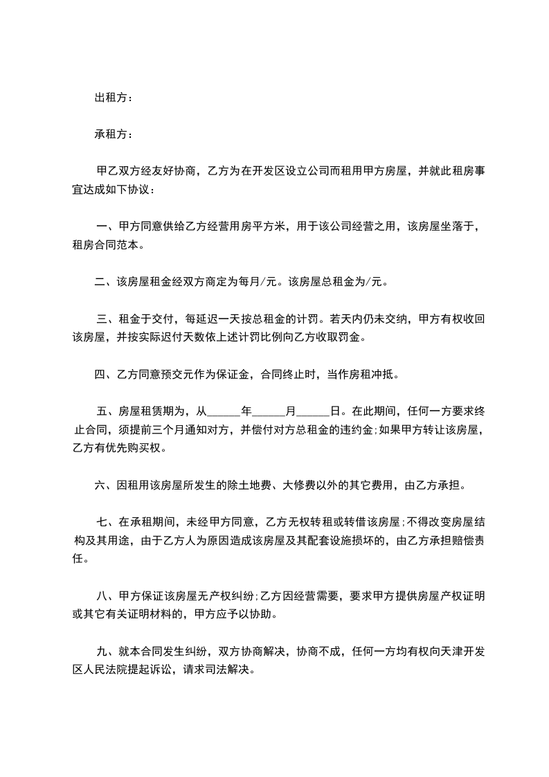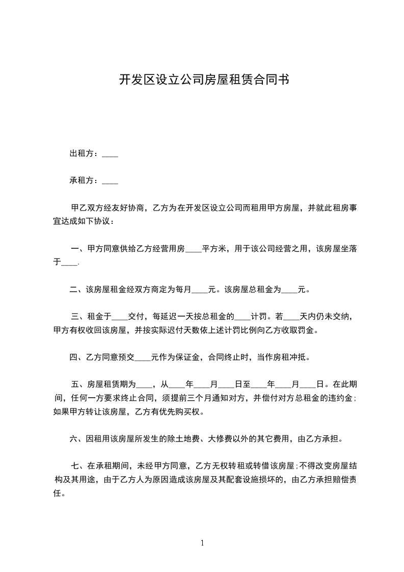 甲乙双方经友好协商,乙方为在开发区设立公司而租用甲方房屋,并就此租房事宜达成如下协议:
