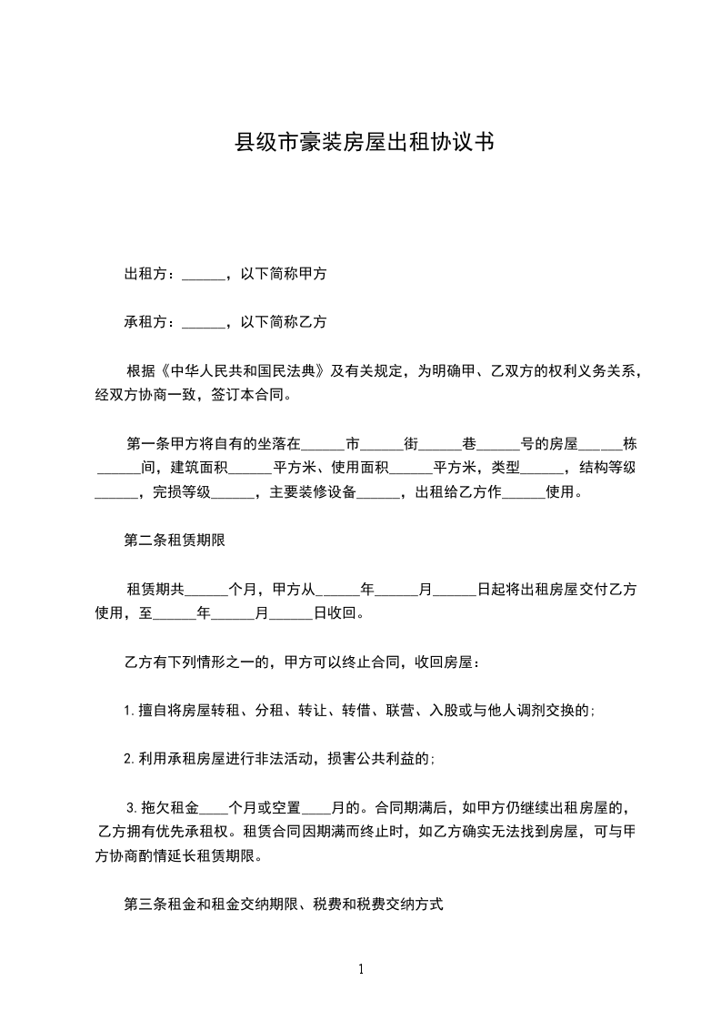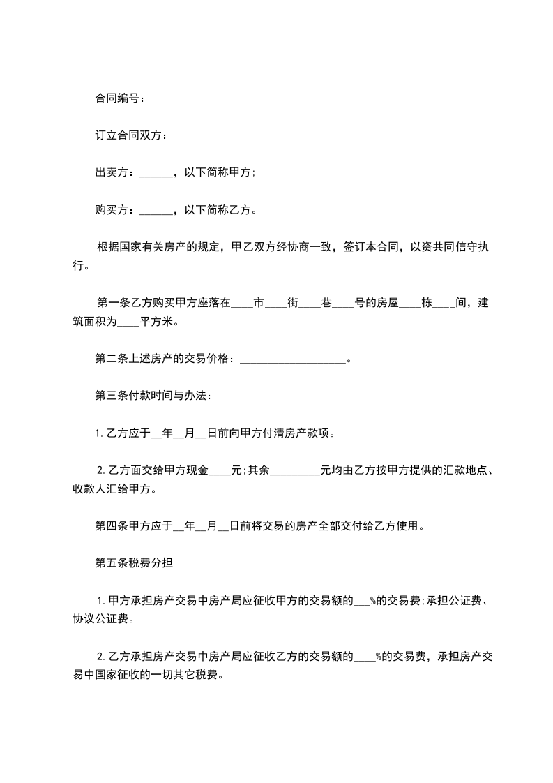第一条乙方购买甲方座落在____市____街____巷____号的房屋____栋____间,建筑面积为____平方米。