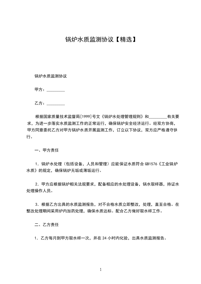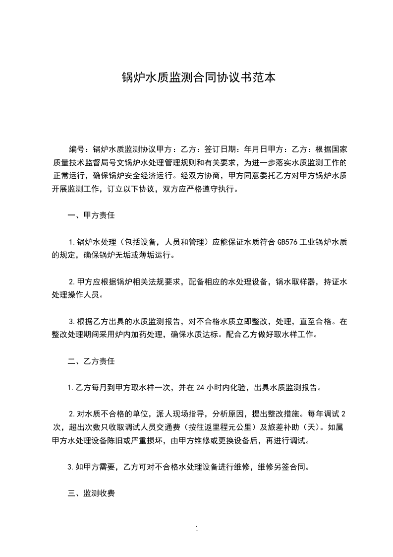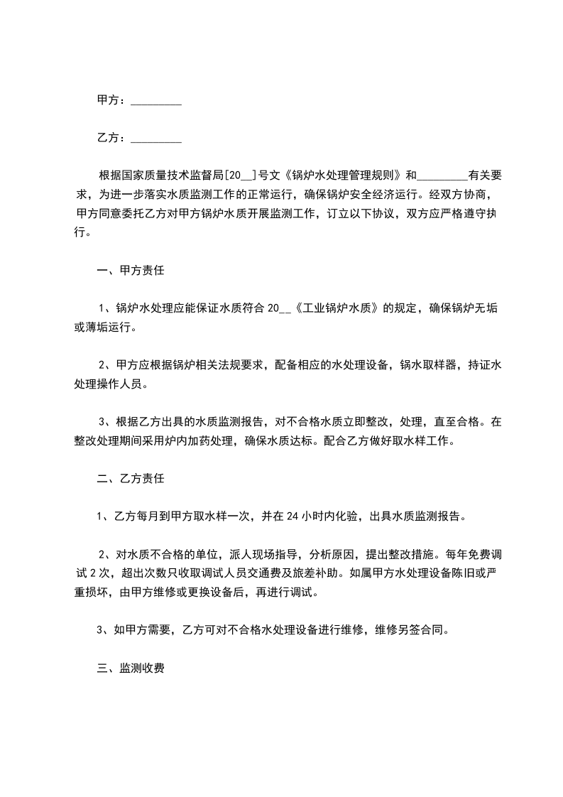 根据国家质量技术监督局[20__]号文《锅炉水处理管理规则》和_________有关要求,为进一步落实水质监测工作的正常运行,确保锅炉安全经济运行。经双方协商,甲方同意委托乙方对甲方锅炉水质开展监测工作,订立以下协议,双方应严格遵守执行。