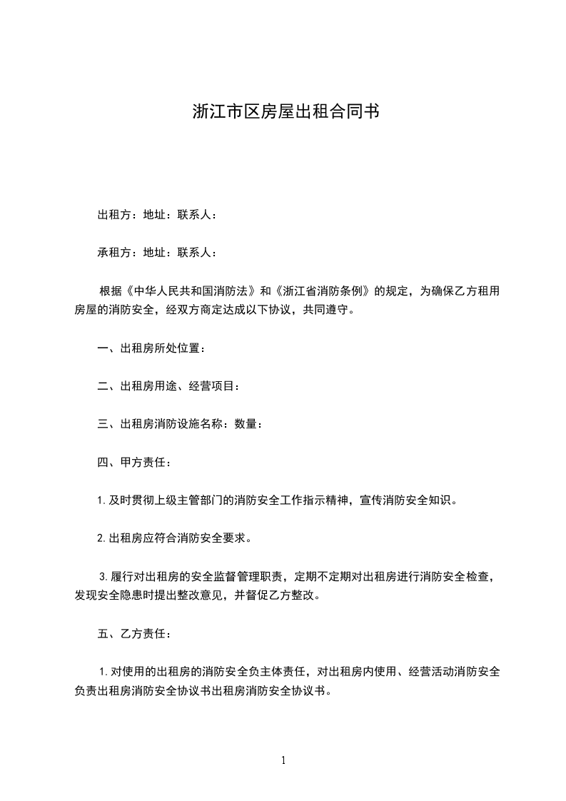 根据《中华人民共和国消防法》和《浙江省消防条例》的规定,为确保乙方租用房屋的消防安全,经双方商定达成以下协议,共同遵守。