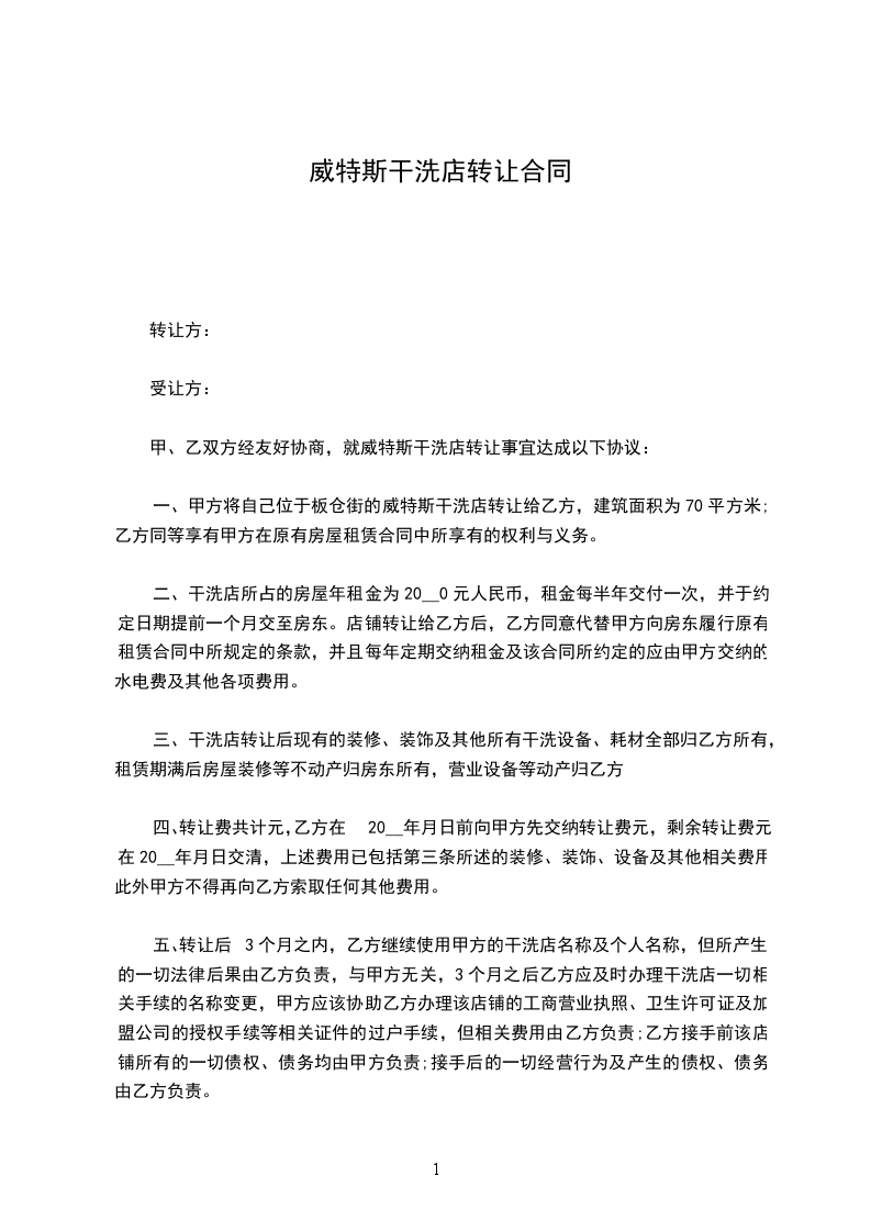 一、甲方将自己位于板仓街的威特斯干洗店转让给乙方,建筑面积为70平方米;乙方同等享有甲方在原有房屋租赁合同中所享有的权利与义务。
