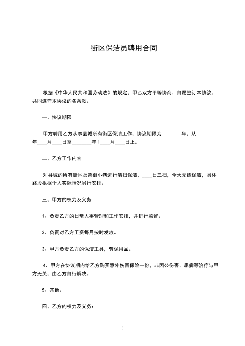 甲方聘用乙方从事县城所有街区保洁工作,协议期限为________年,从________年____月____日至________年1____月____日止。