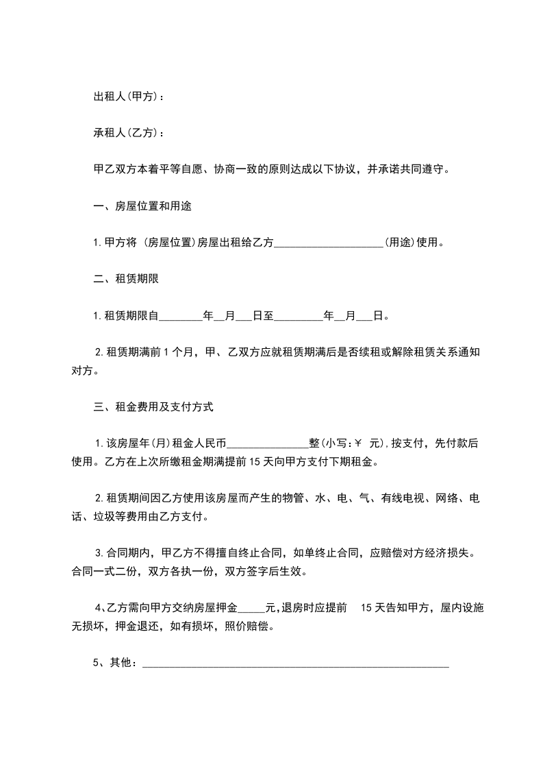 二、本房屋月租金为人民币____元,按月季度年结算。每月月初每季季初每年年初____日内,乙方向甲方支付全月季年租金。
