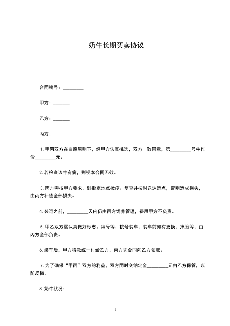 1.甲丙双方在自愿原则下,经甲方认真挑选,双方一致同意,第_________号牛作价_________元。