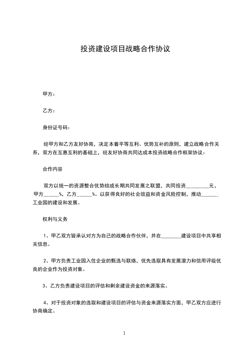 双方以统一的资源整合优势结成长期共同发展之联盟,共同投资_________元,甲方______%,乙方______%。以获得良好的社会效益和资金风险控制,推动_______工业园的建设和发展。