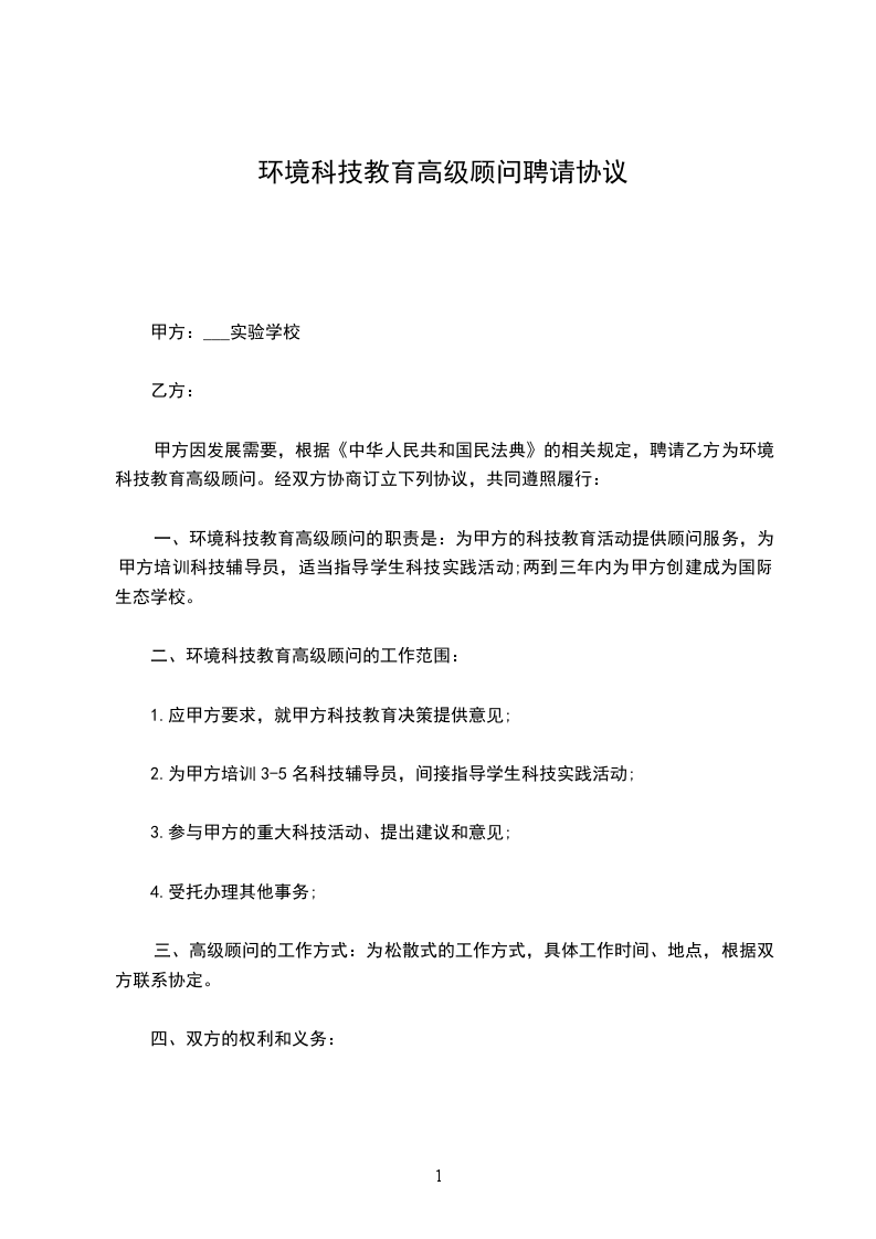 甲方因发展需要,根据《中华人民共和国民法典》的相关规定,聘请乙方为环境科技教育高级顾问。经双方协商订立下列协议,共同遵照履行: