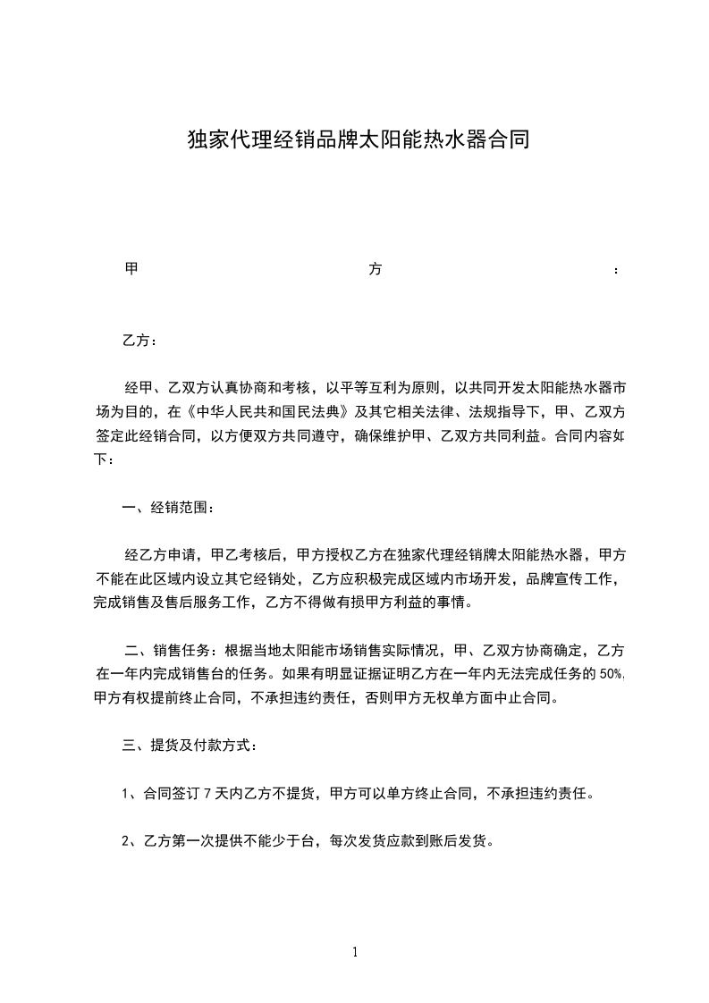 经甲、乙双方认真协商和考核,以平等互利为原则,以共同开发太阳能热水器市场为目的,在《中华人民共和国民法典》及其它相关法律、法规指导下,甲、乙双方签定此经销合同,以方便双方共同遵守,确保维护甲、乙双方共同利益。合同内容如下: