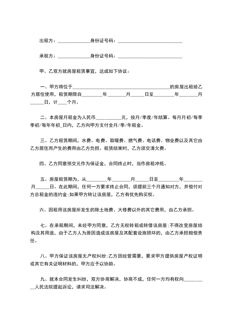 一、甲方将位于__________________________________________的房屋出租给乙方居住使用,租赁期限自_________年________月______日至_________年________月______日,计____个月。