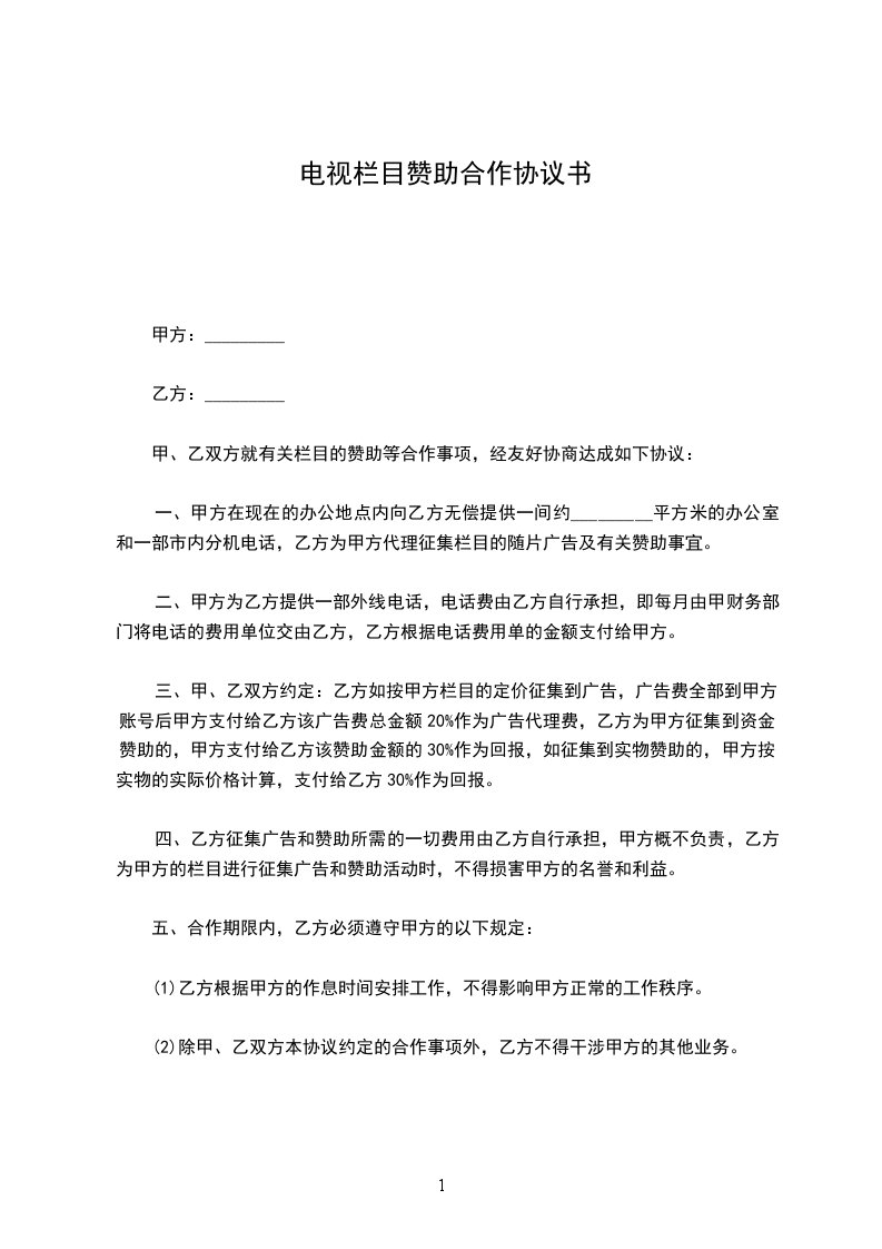 一、甲方在现在的办公地点内向乙方无偿提供一间约20平方米的办公室和一部市内分机电话,乙方为甲方代理征集《________》栏目的随片广告及有关赞助事宜。