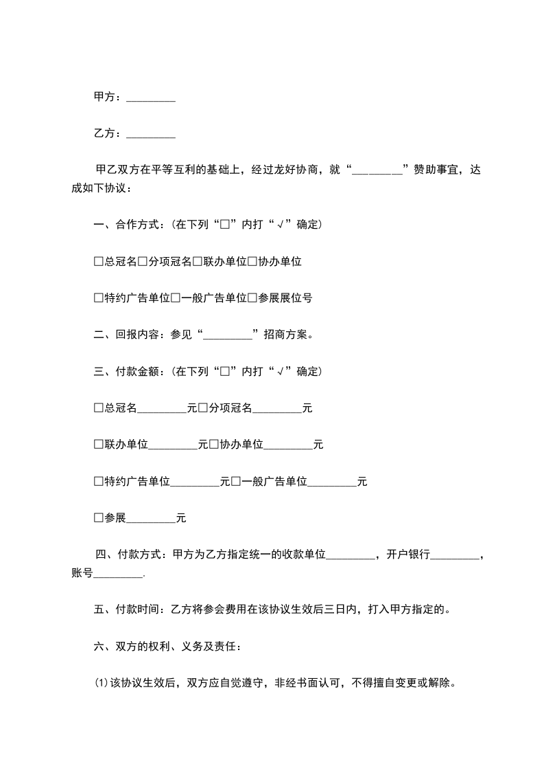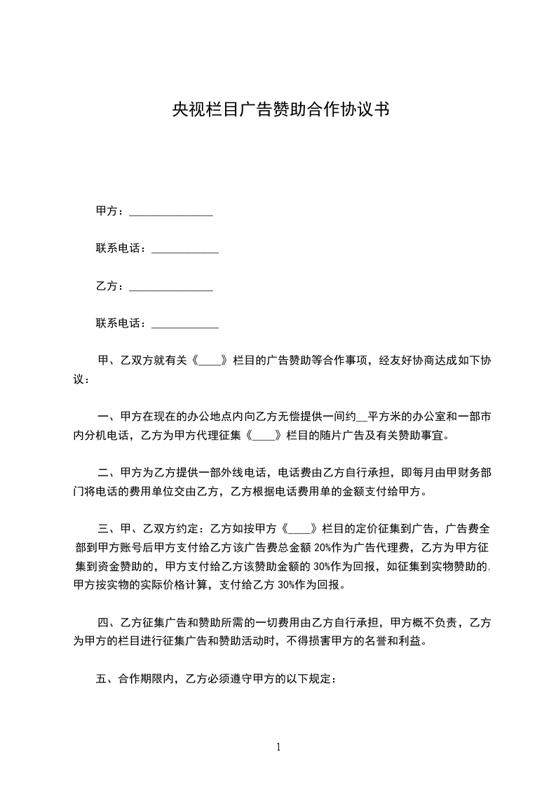 甲、乙双方就有关《____________》栏目的广告赞助等合作事项,经友好协商达成如下协议: