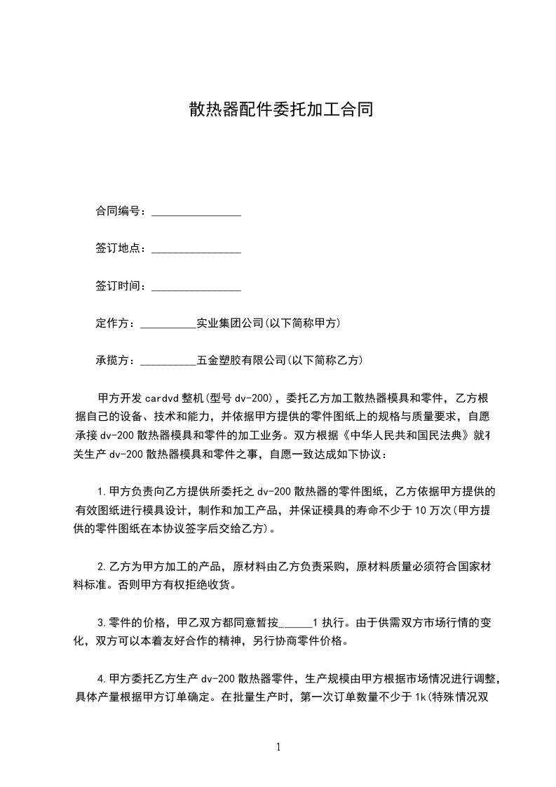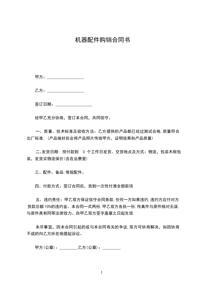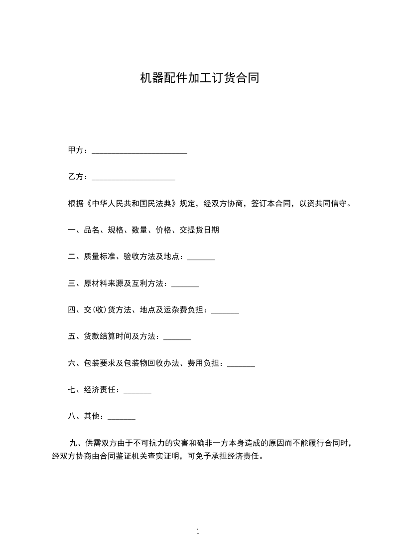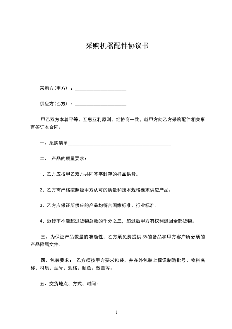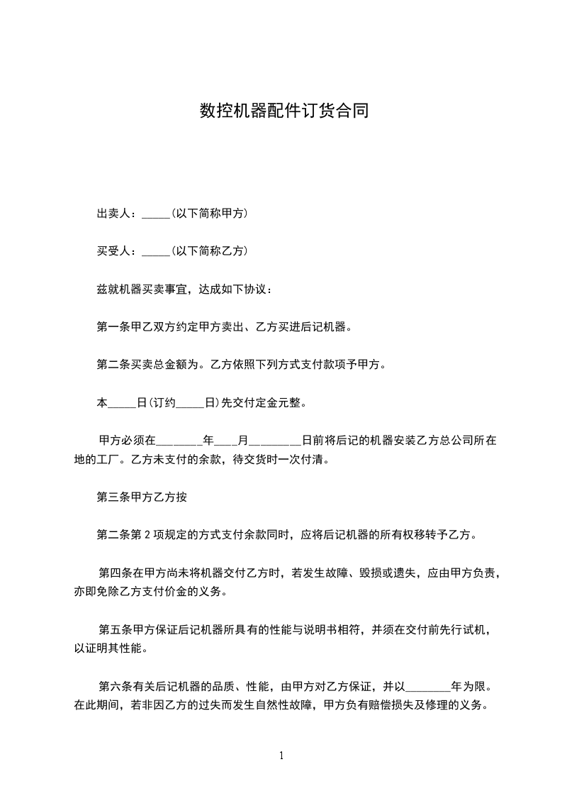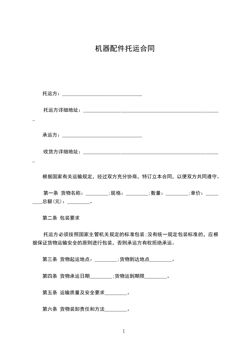 第一条 货物名称:_________;规格:_________;数量:_________;单价:_________总额(元):_________。