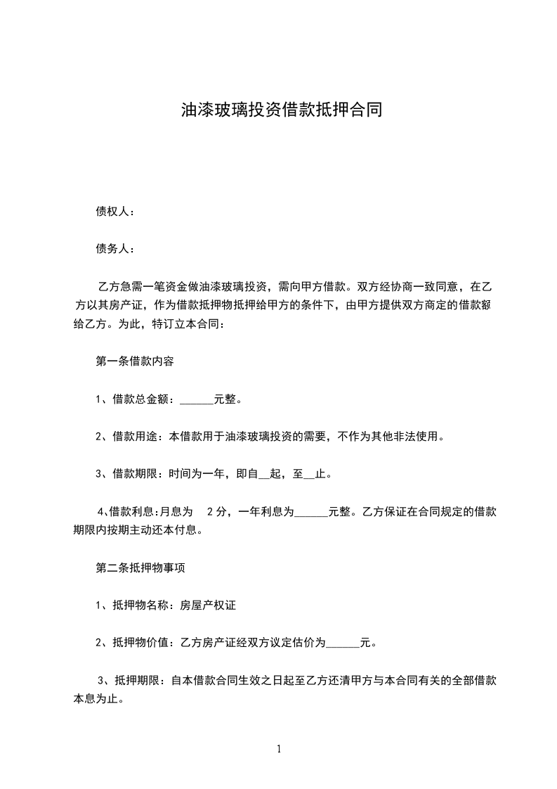 乙方急需一笔资金做油漆玻璃投资,需向甲方借款。双方经协商一致同意,在乙方以其房产证,作为借款抵押物抵押给甲方的条件下,由甲方提供双方商定的借款额给乙方。为此,特订立本合同: