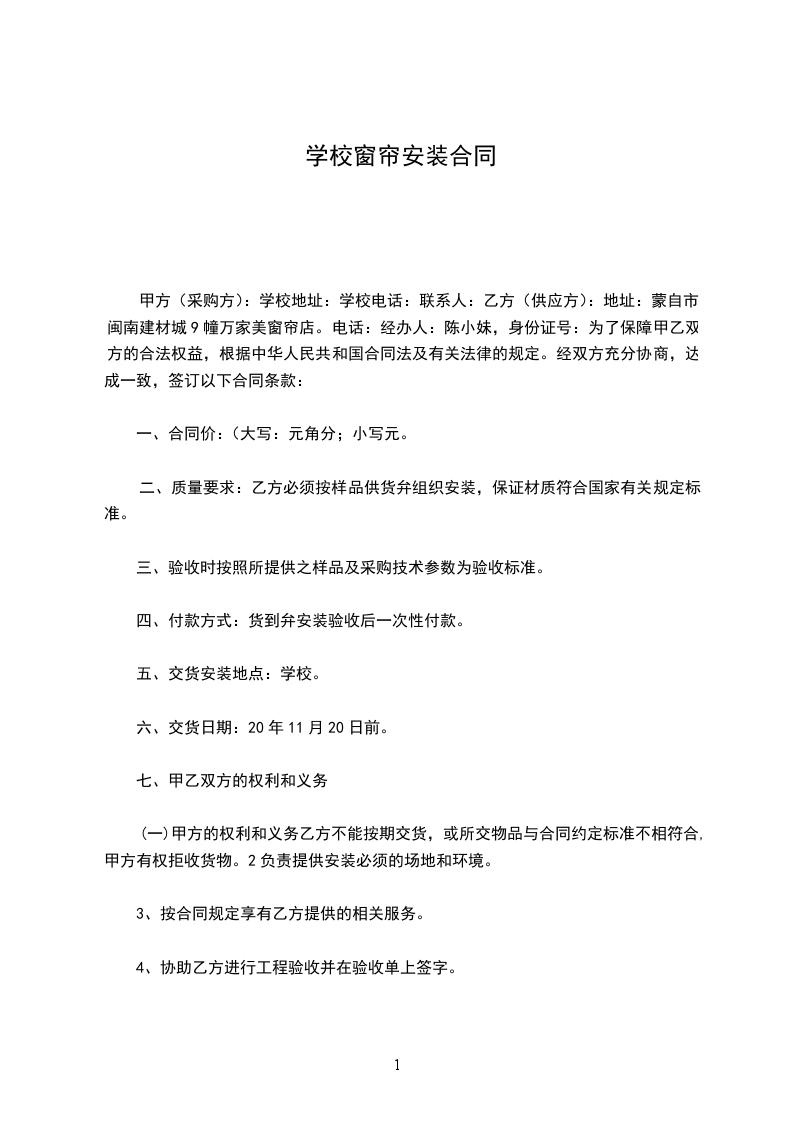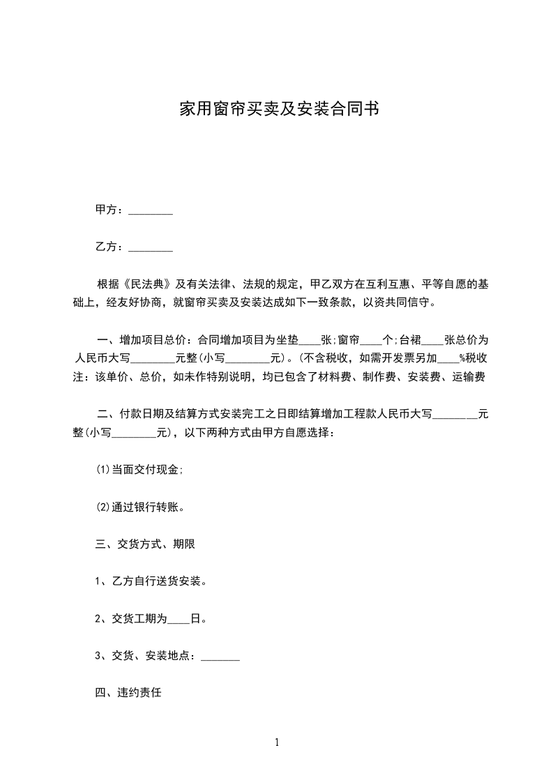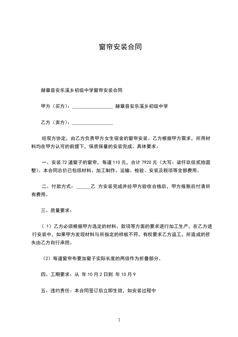 三、 乙方责任:窗帘的类型、规格、颜色、材质、按甲方要求的样板进行生产,安装.于________年________月________日前安装完毕。