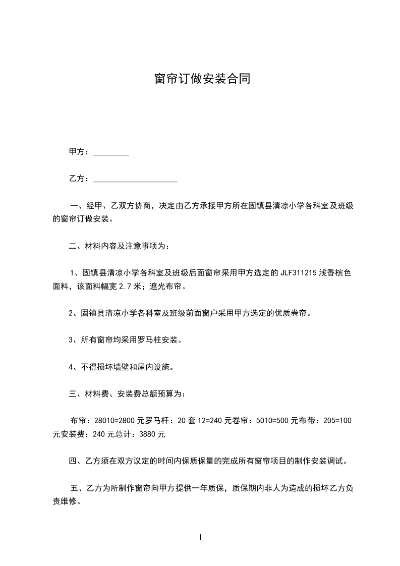 六、 质量保证及售后服务:乙方提供窗帘部分半年免费保修,配件部分提供一年免费保修(人为损坏除外)