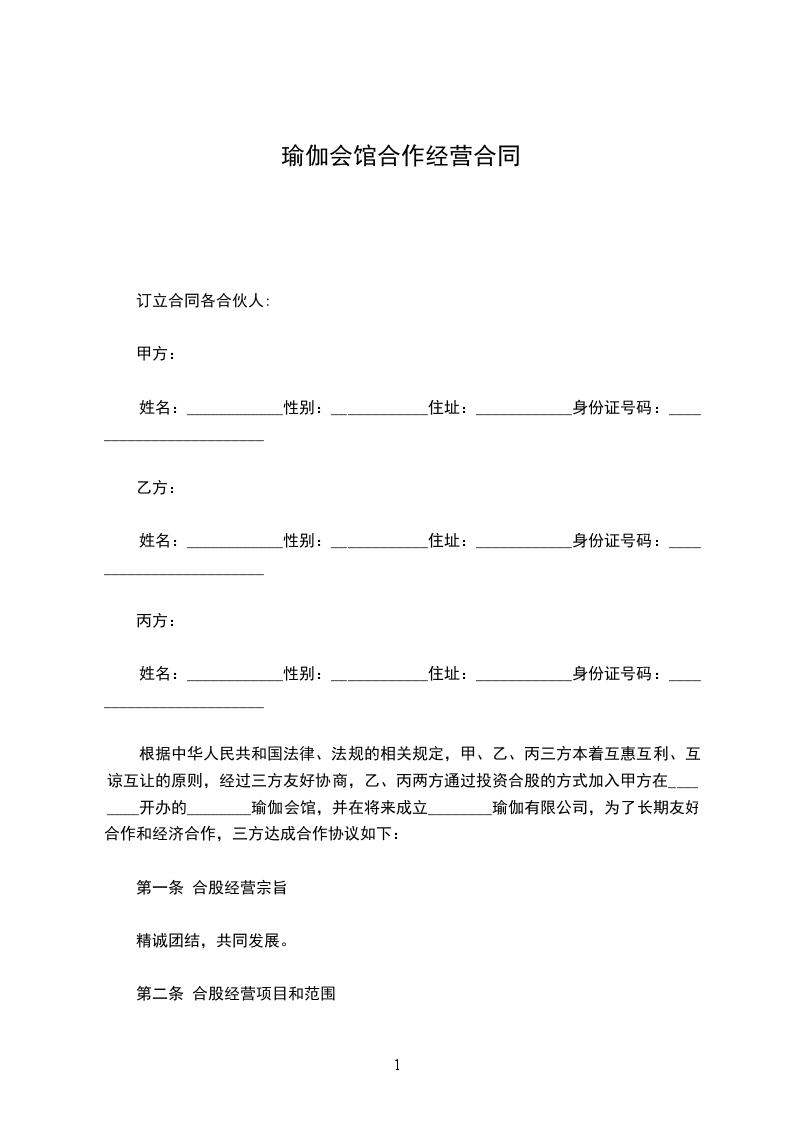 根据中华人民共和国法律、法规的相关规定,甲、乙、丙三方本着互惠互利、互谅互让的原则,经过三方友好协商,乙、丙两方通过投资合股的方式加入甲方在________开办的________瑜伽会馆,并在将来成立________瑜伽有限公司,为了长期友好合作和经济合作,三方达成合作协议如下: