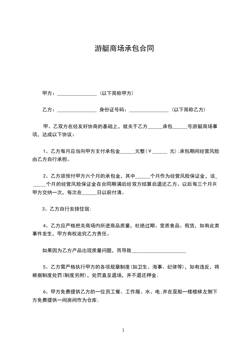甲、乙双方在经友好协商的基础上,就关于乙方______承包______号游艇商场事项,达成以下协议: