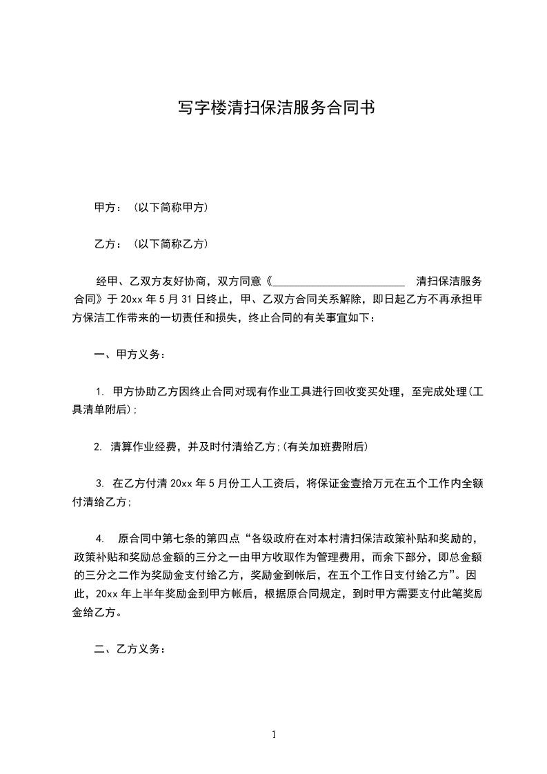 经甲、乙双方友好协商,双方同意《________________________ 清扫保洁服务合同》于20xx年5月31日终止,甲、乙双方合同关系解除,即日起乙方不再承担甲方保洁工作带来的一切责任和损失,终止合同的有关事宜如下: