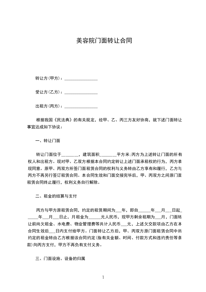 根据我国《民法典》的有关规定,经甲、乙、丙三方友好协商,就下述门面转让事宜达成如下协议:
