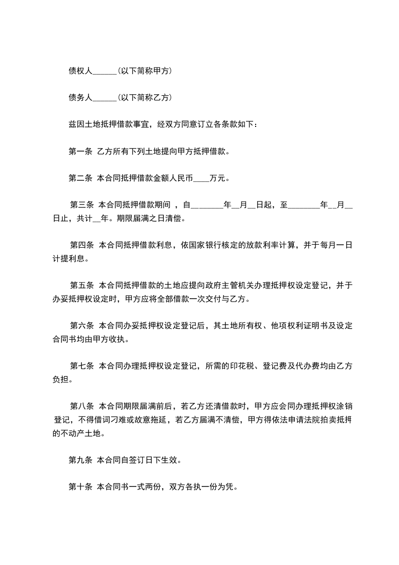 兹因土地抵押借款事宜,经双方同意订立各条款如下: