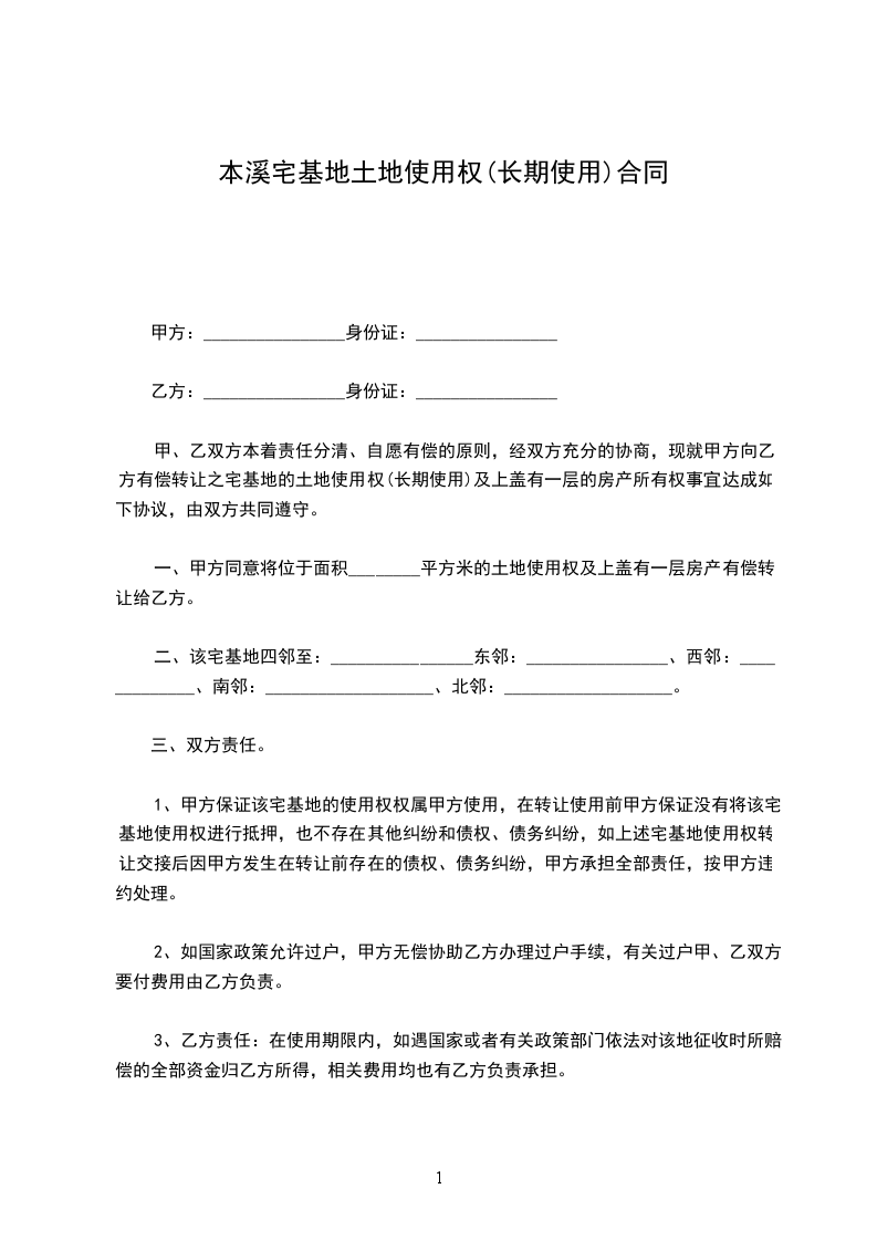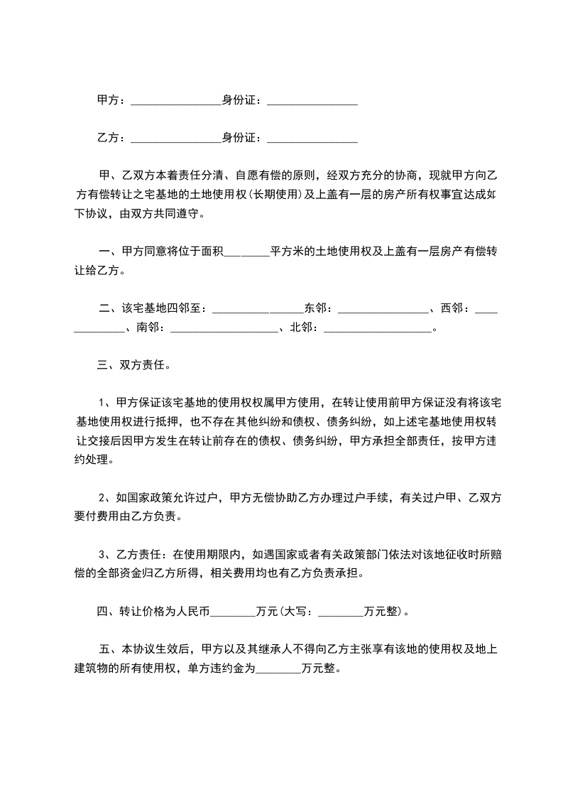 甲、乙双方本着责任分清、自愿有偿的原则,经双方充分的协商,现就甲方向乙方有偿转让之宅基地的土地使用权(长期使用)及上盖有一层的房产所有权事宜达成如下协议,由双方共同遵守。