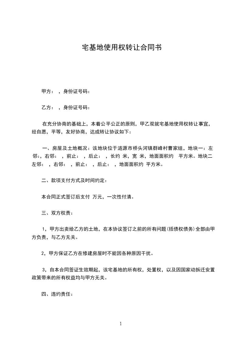 1、甲方保证该宅基地的使用权权属甲方使用,在转让使用前甲方保证没有将该宅基地使用权进行抵押,也不存在其他纠纷和债权、债务纠纷,如上述宅基地使用权转让交接后因甲方发生在转让前存在的债权、债务纠纷,甲方承担全部责任,按甲方违约处理。