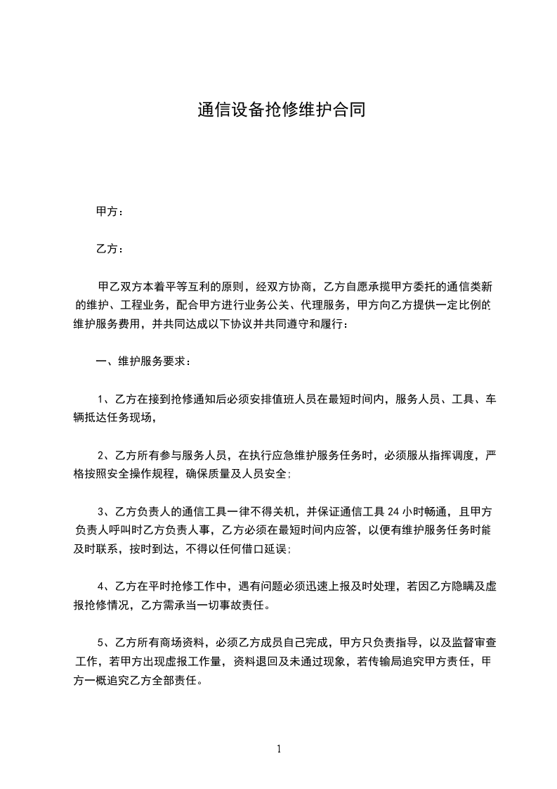 4、乙方在平时抢修工作中,遇有问题必须迅速上报及时处理,若因乙方隐瞒及