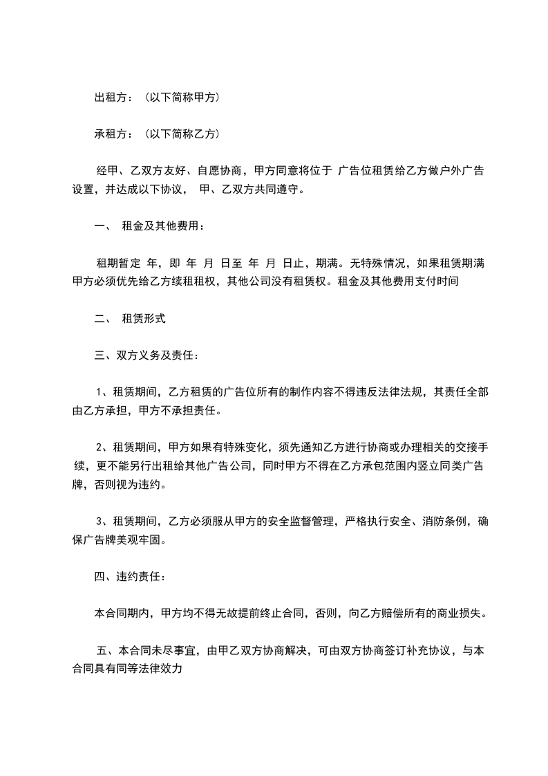 经甲、乙双方友好、自愿协商,甲方同意将位于 广告位租赁给乙方做户外广告设置,并达成以下协议, 甲、乙双方共同遵守。