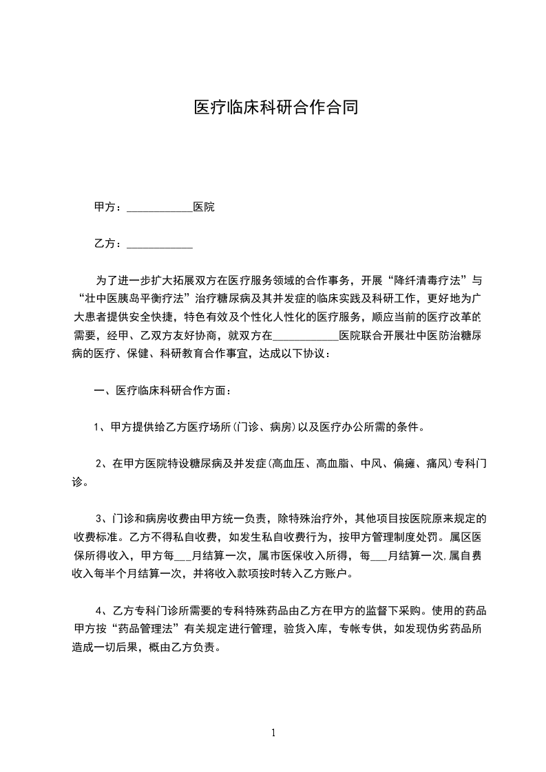 为了进一步扩大拓展双方在医疗服务领域的合作事务,开展“降纤清毒疗法”与“壮中医胰岛平衡疗法”治疗糖尿病及其并发症的临床实践及科研工作,更好地为广大患者提供安全快捷,特色有效及个性化人性化的医疗服务,顺应当前的医疗改革的需要,经甲、乙双方友好协商,就双方在____________医院联合开展壮中医防治糖尿病的医疗、保健、科研教育合作事宜,达成以下协议: