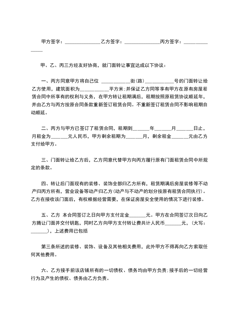 第二条、该店铺的产权人为丙。丙与甲方签订了租赁合同,租期到_________年_________月_______日止,月租为_________元人民币。店铺交给乙方后,乙同意代替甲向丙履行该租赁合同,每月交纳租金及该合同约定由甲交纳的水电费等各项费用。