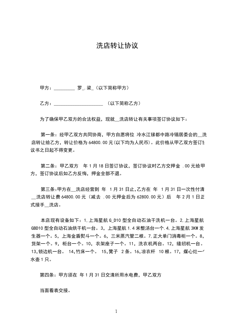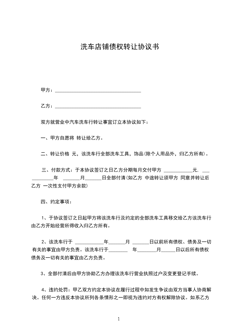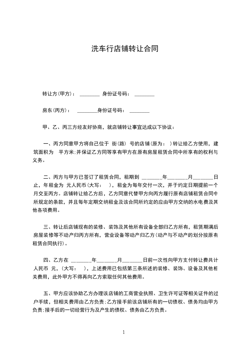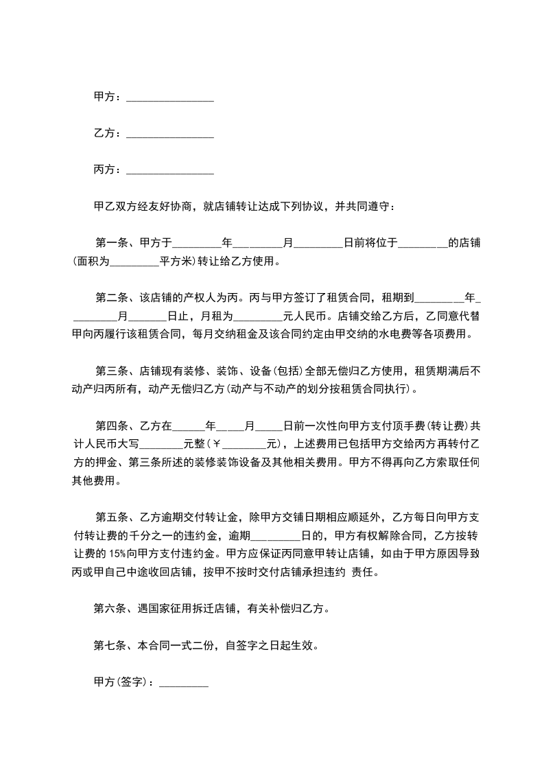 第一条、甲方于_________年_________月_________日前将位于_________的店铺(面积为_________平方米)转让给乙方使用。
