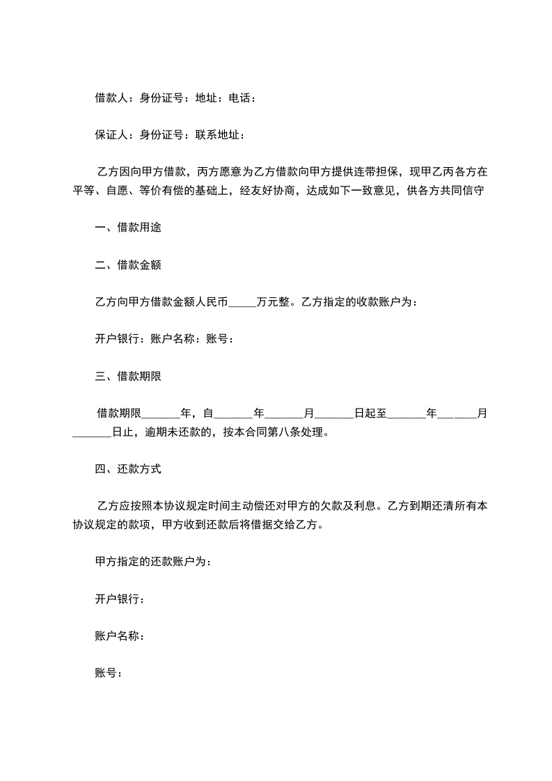 乙方因向甲方借款,丙方愿意为乙方借款向甲方提供连带担保,现甲乙丙各方在平等、自愿、等价有偿的基础上,经友好协商,达成如下一致意见,供各方共同信守。