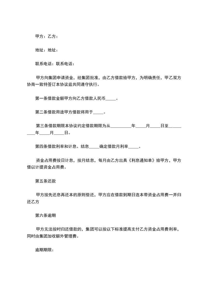 甲方向集团申请资金,经集团批准,由乙方借款给甲方,为明确责任,甲乙双方协商一致特签订本协议兹共同遵守执行。