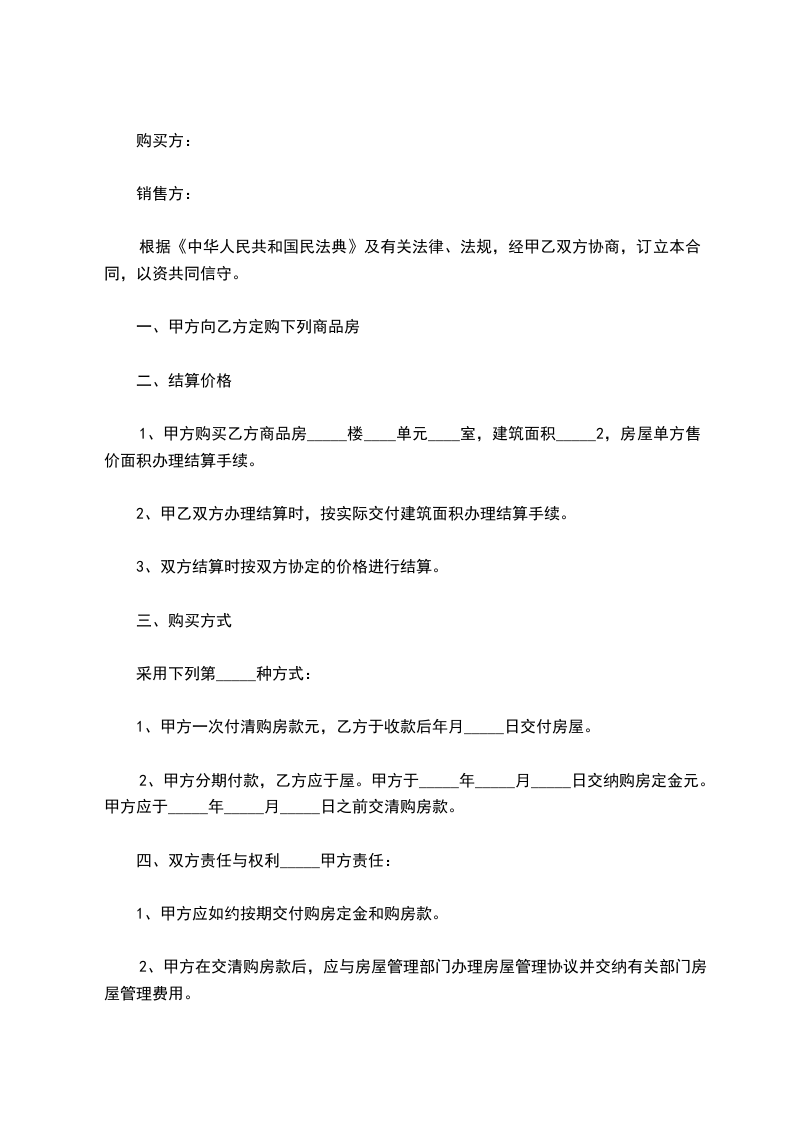 1、甲方购买乙方商品房_____楼____单元____室,建筑面积_____2,房屋单方售价面积办理结算手续。