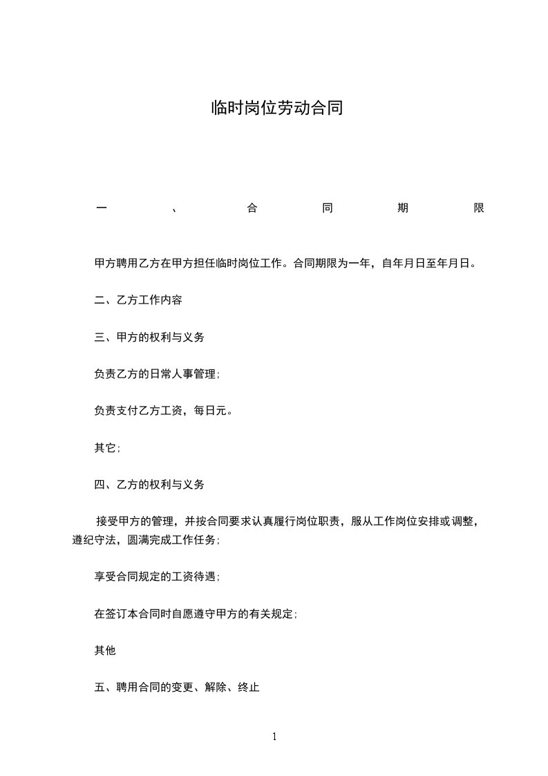 甲方聘用乙方在甲方担任临时岗位工作。合同期限为一年,自_____年_____月_____日至_____年_____月_____日。