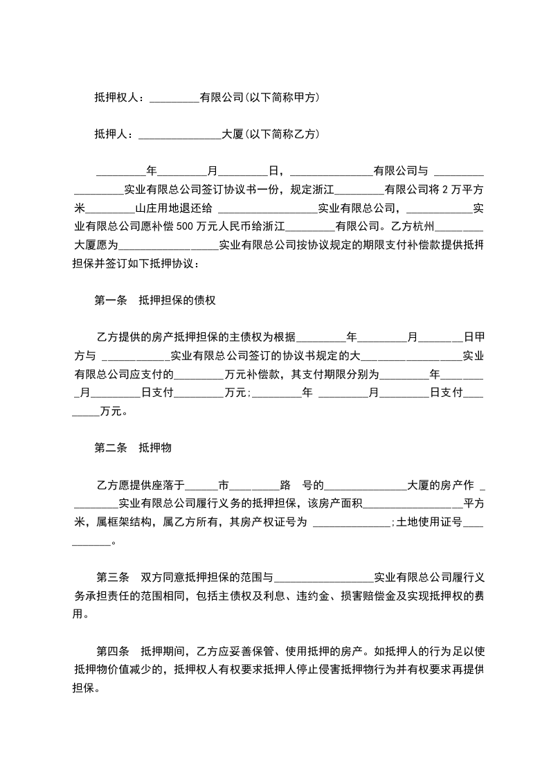 _________年_________月_________日,_______________有限公司与__________________实业有限总公司签订协议书一份,规定浙江_________有限公司将2万平方米_________山庄用地退还给__________________实业有限总公司,____________实业有限总公司愿补偿500万元人民币给浙江_________有限公司。乙方杭州_________大厦愿为__________________实业有限总公司按协议规定的期限支付补偿款提供抵押担保并签订如下抵押协议: