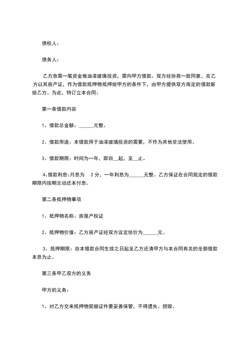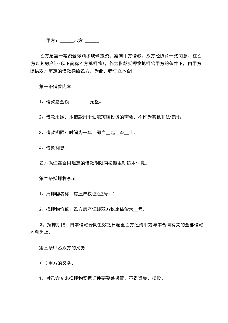 乙方急需一笔资金做油漆玻璃投资,需向甲方借款。双方经协商一致同意,在乙方以其房产证,作为借款抵押物抵押给甲方的条件下,由甲方提供双方商定的借款额给乙方。为此,特订立本合同: