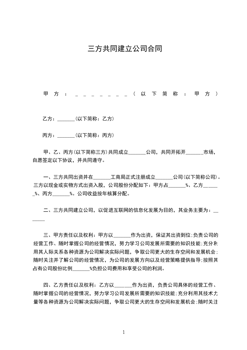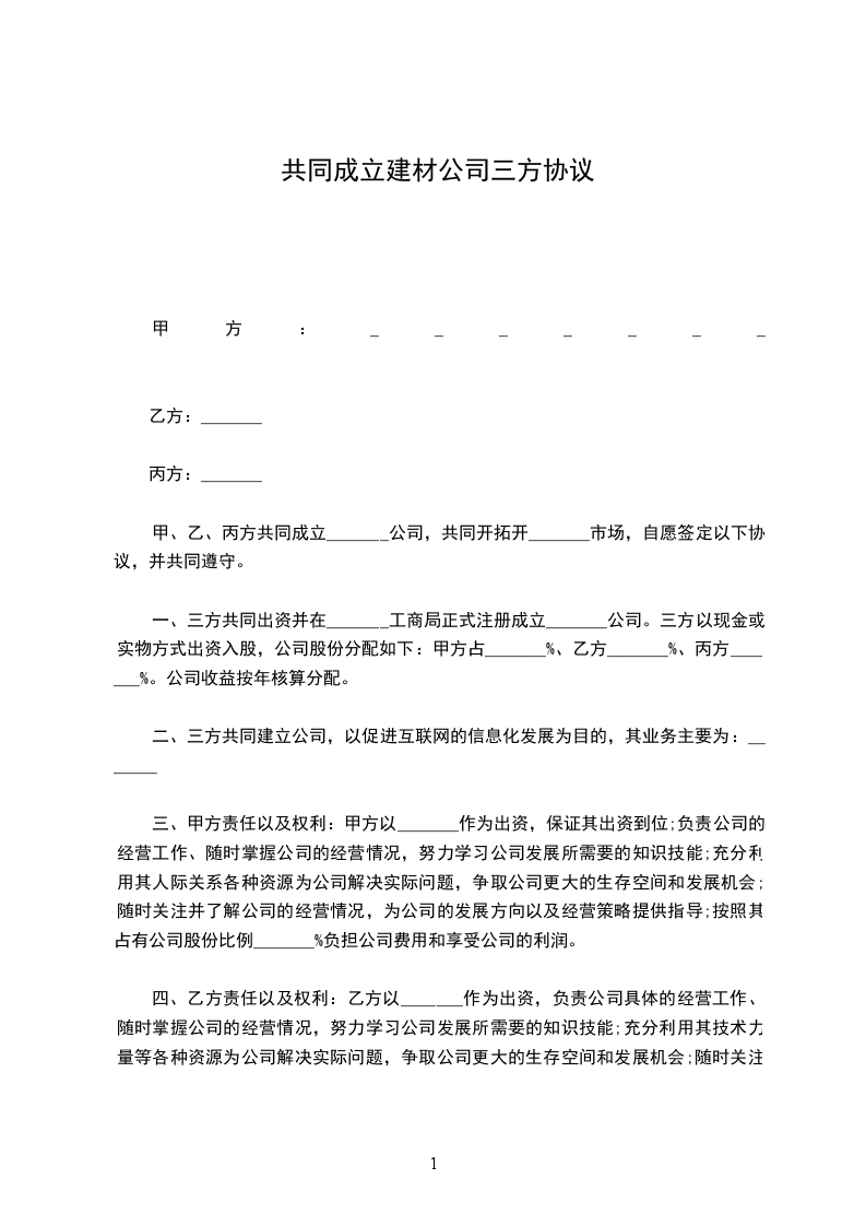 甲、乙、丙方共同成立_______公司,共同开拓开_______市场,自愿签定以下协议,并共同遵守。