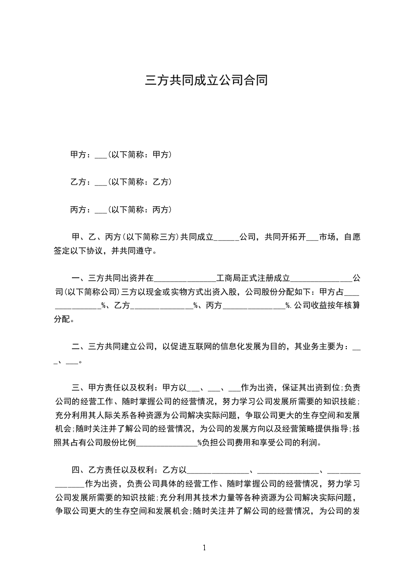 一、三方共同出资并在_______工商局正式注册成立_______公司。三方以现金或实物方式出资入股,公司股份分配如下:甲方占_______%、乙方_______%、丙方_______%。公司收益按年核算分配。