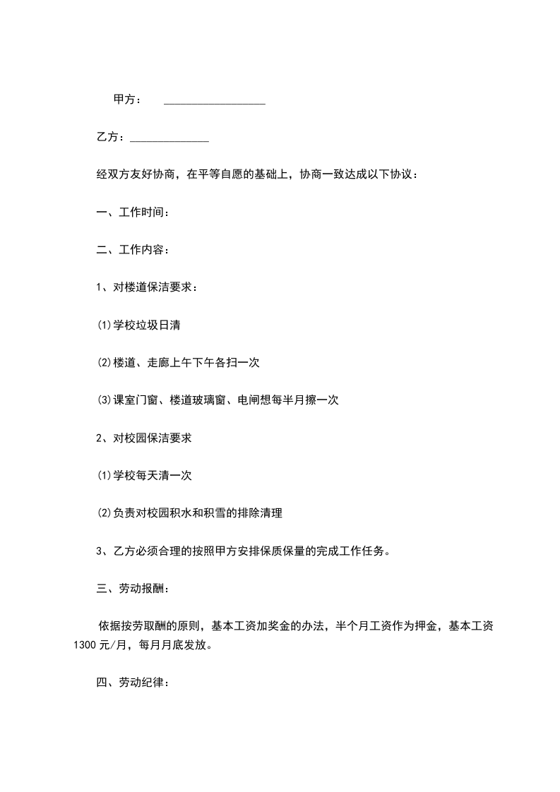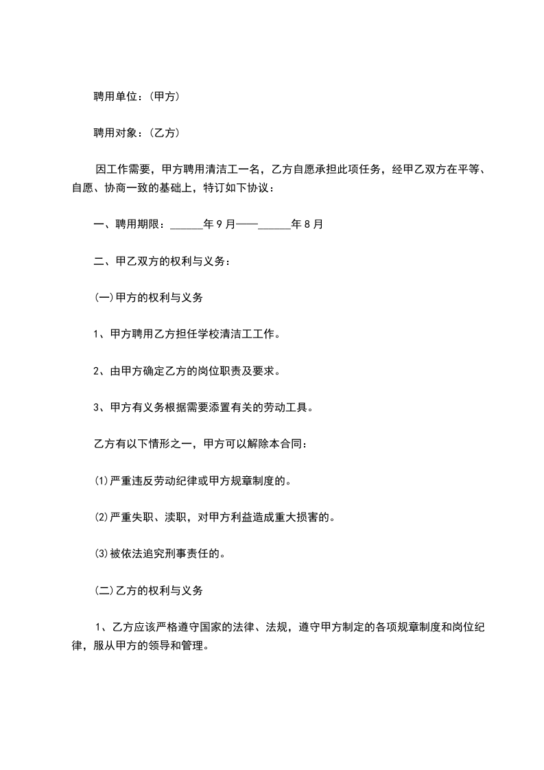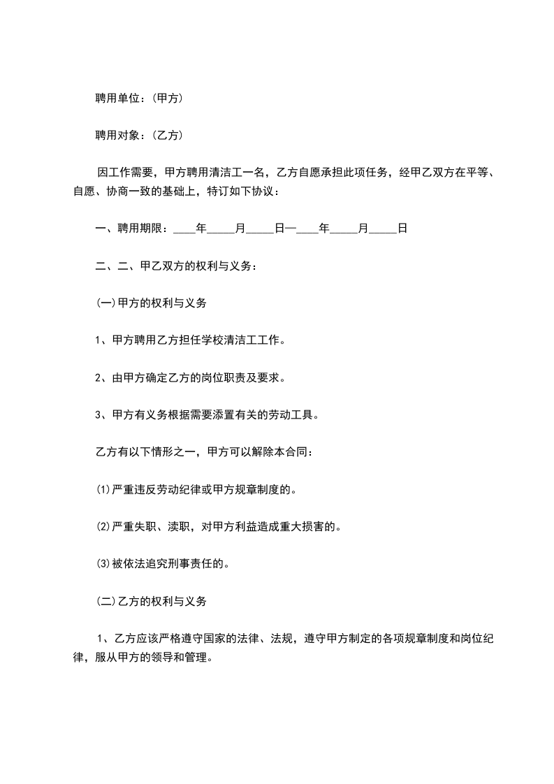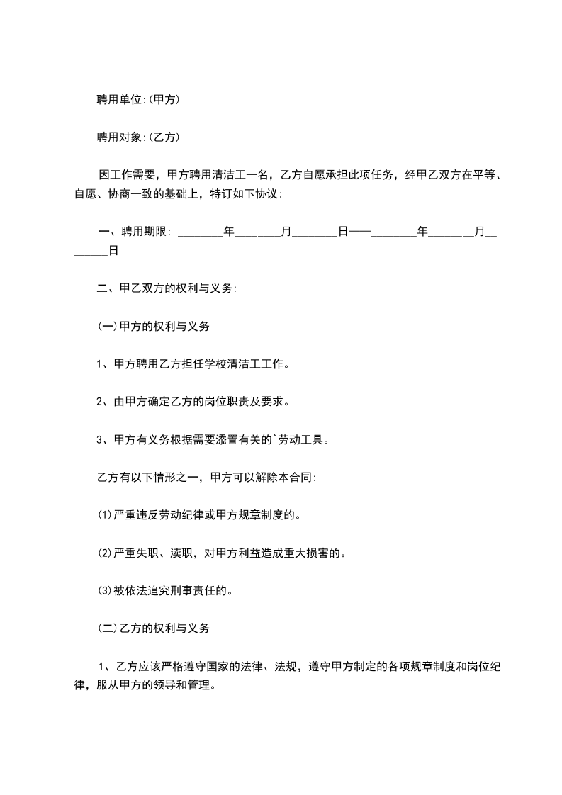 1、甲方聘用乙方担任学校清洁工工作。