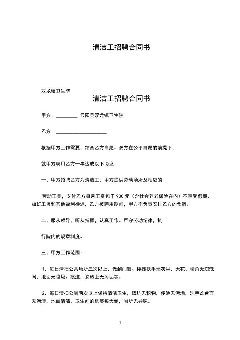 因工作需要,甲方聘用清洁工一名,乙方自愿承担此项任务,经甲乙双方在平等、自愿、协商一致的基础上,特订如下协议: