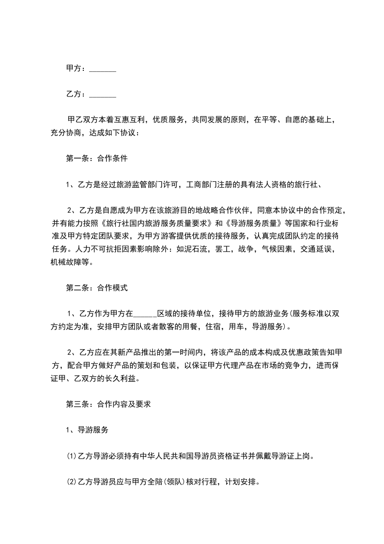 二、甲方无偿向乙方推荐注册导游,并提供导游的有关简历及工作情况,做好各项服务工作。