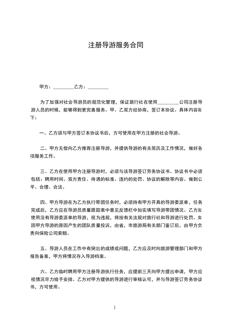 一、乙方须与甲方签订本协议书后,方可使用在甲方注册的社会导游。