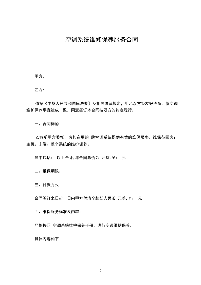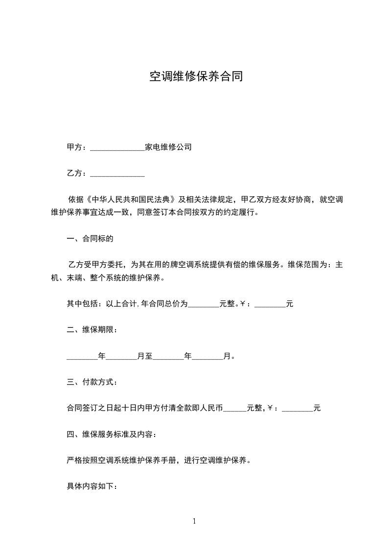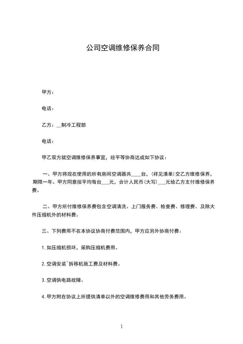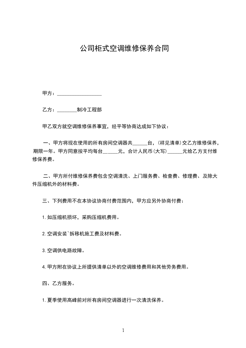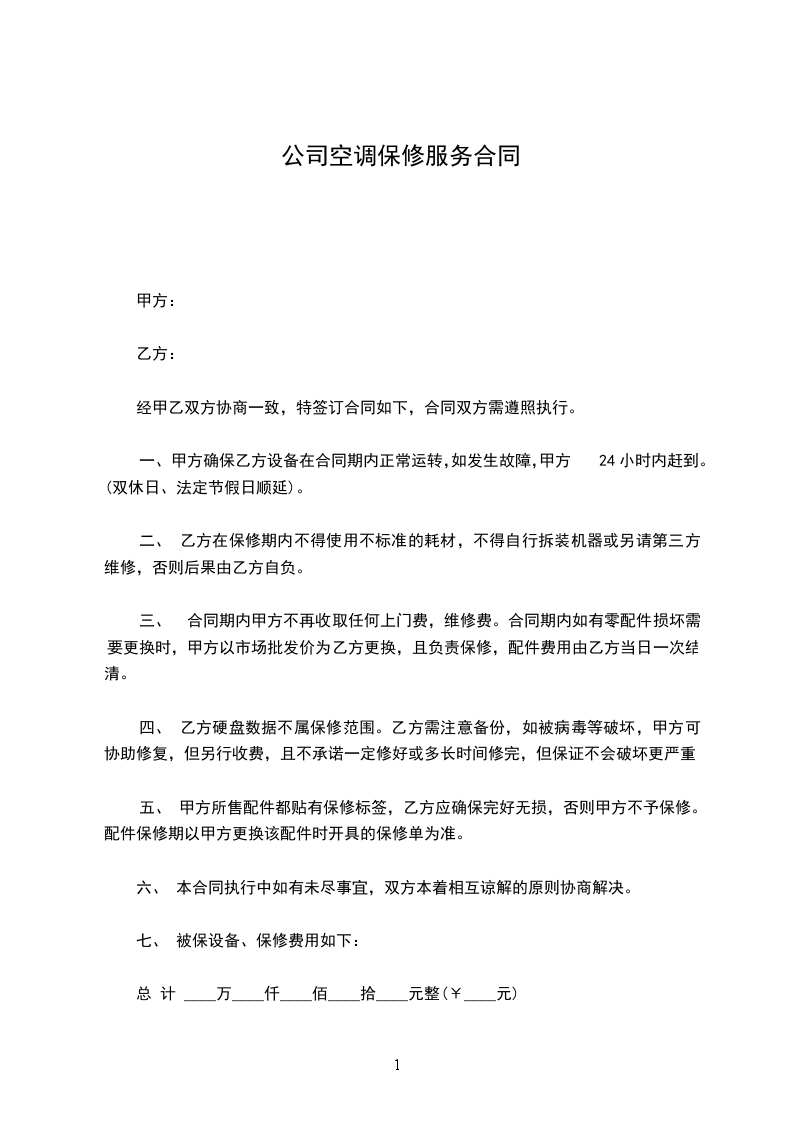 三、 合同期内甲方不再收取任何上门费,维修费。合同期内如有零配件损坏需要更换时,甲方以市场批发价为乙方更换,且负责保修,配件费用由乙方当日一次结清。