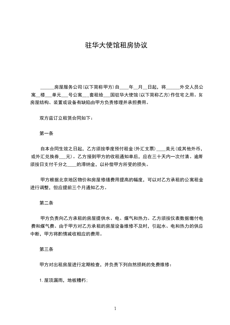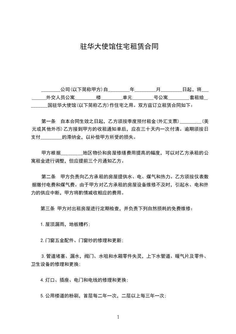 ________公司(以下简称甲方)自_________年_________月_________日起,将_________外交人员公寓_________楼_________单元_________号公寓_________套租给_________国驻华大使馆(以下简称乙方)作住宅之用。双方兹订立租赁合同如下: