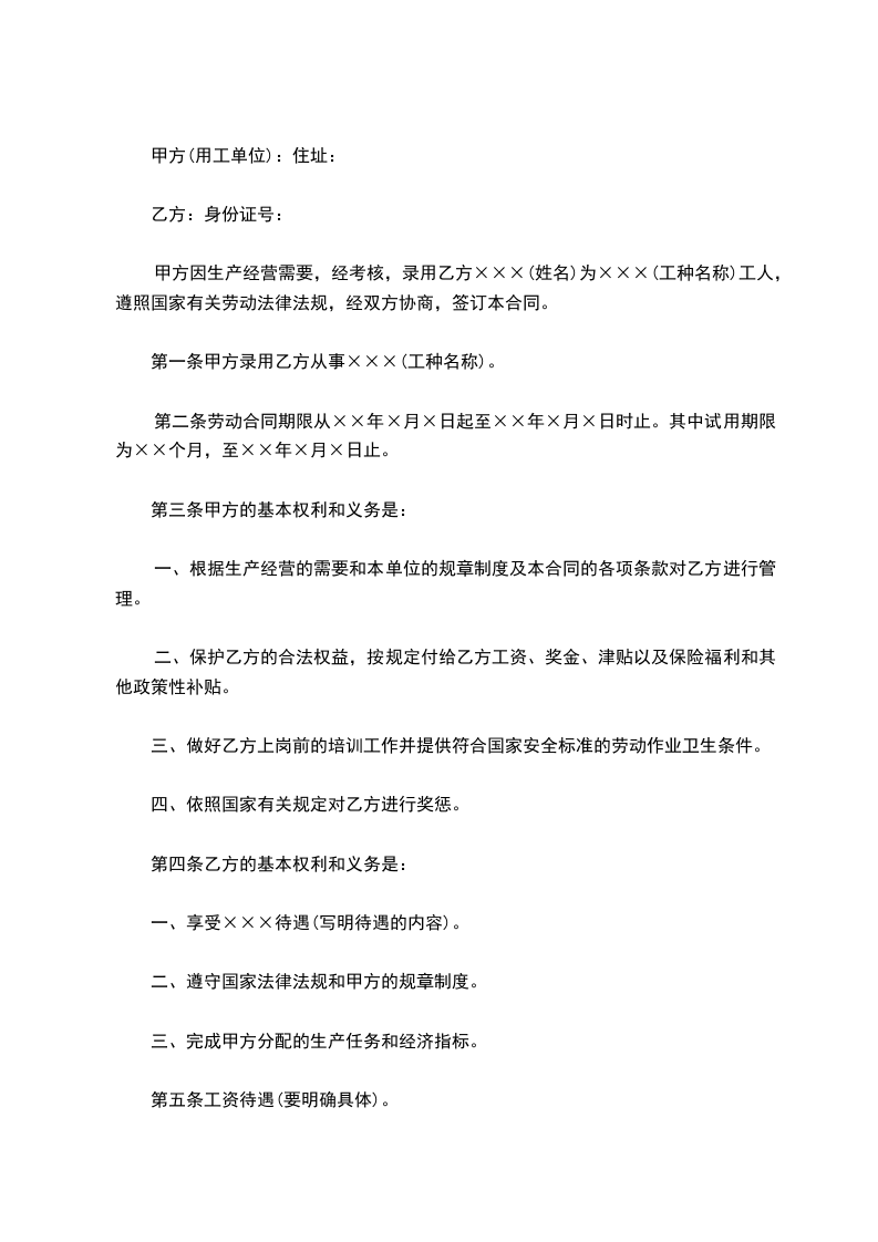 甲方因生产经营需要,经考核,录用乙方×××(姓名)为×××(工种名称)工人,遵照国家有关劳动法律法规,经双方协商,签订本合同。