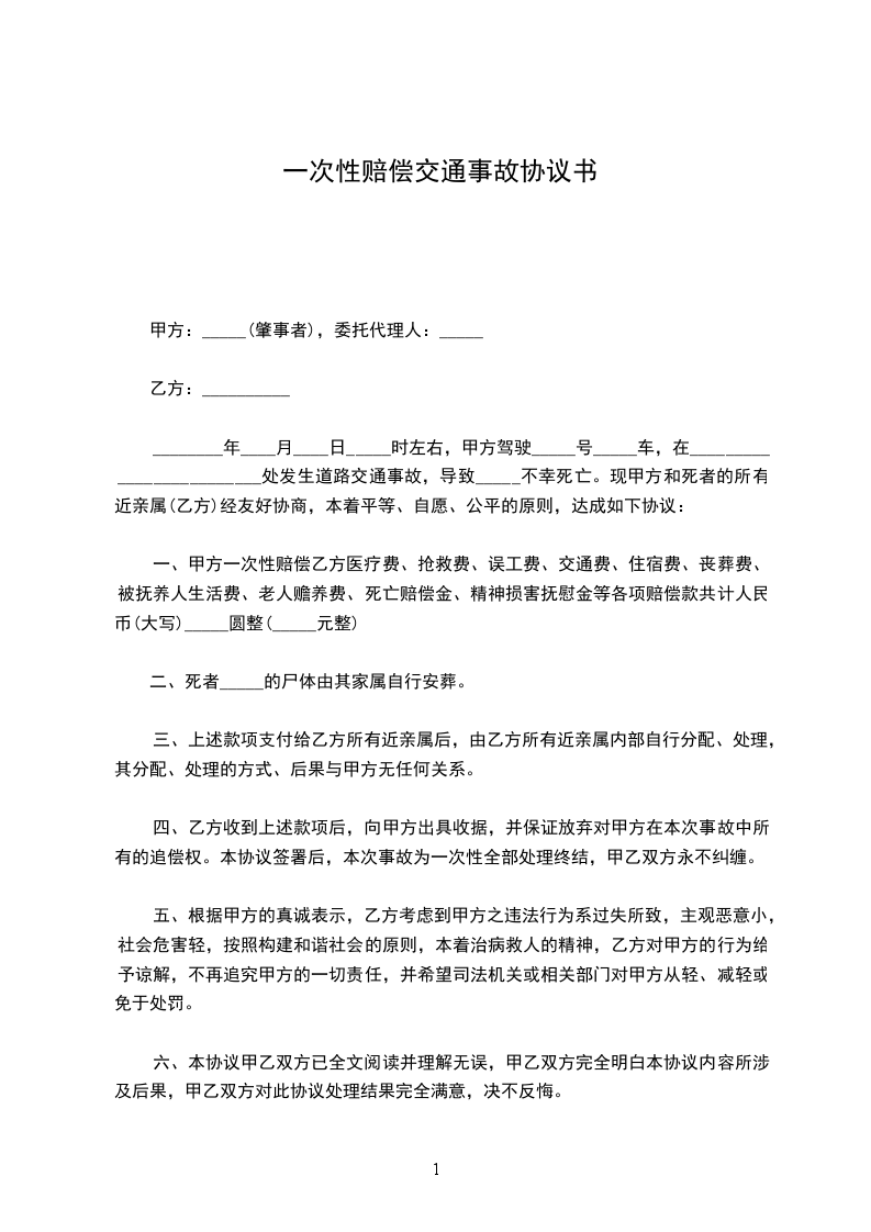 一、甲方一次性赔偿乙方医疗费、抢救费、误工费、交通费、住宿费、丧葬费、被抚养人生活费、老人赡养费、死亡赔偿金、精神损害抚慰金等各项赔偿款共计人民币(大写)_____圆整(_____元整)