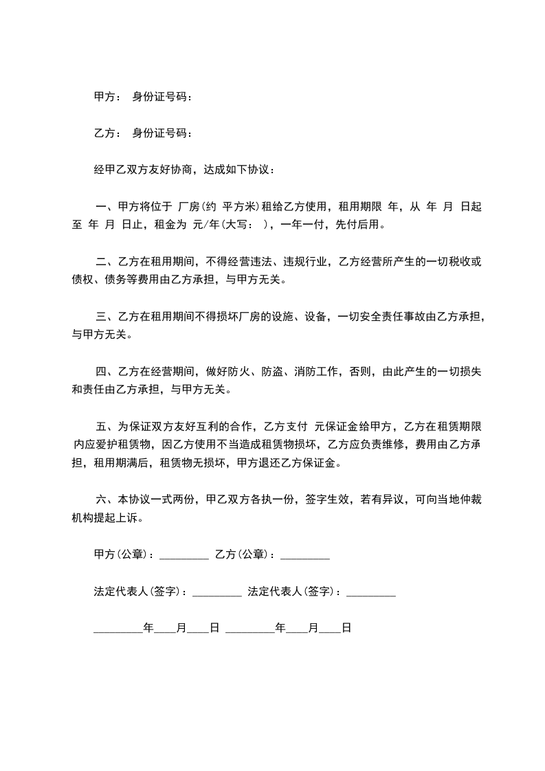 一、甲方将位于 厂房(约 平方米)租给乙方使用,租用期限 年,从 年 月 日起至 年 月 日止,租金为 元/年(大写: ),一年一付,先付后用。