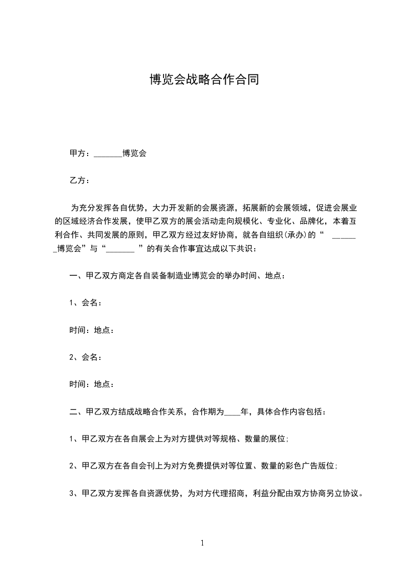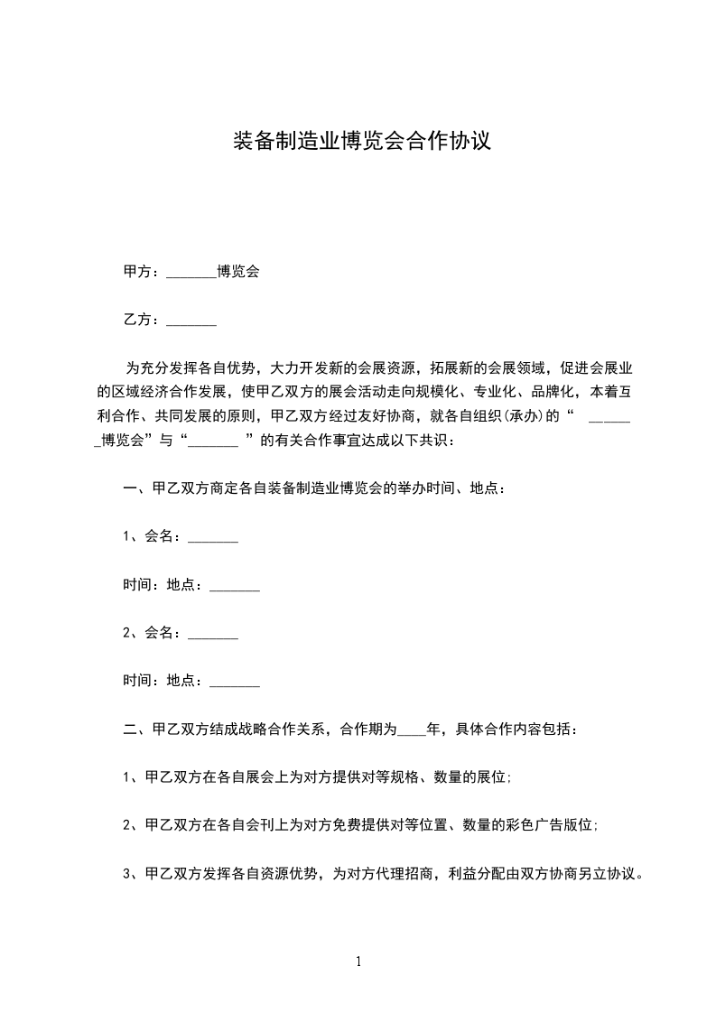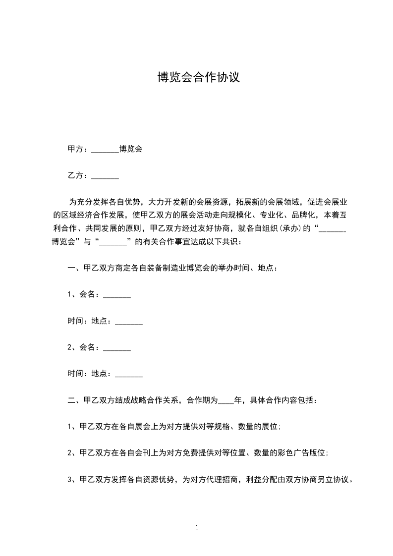 为充分发挥各自优势,大力开发新的会展资源,拓展新的会展领域,促进会展业的区域经济合作发展,使甲乙双方的展会活动走向规模化、专业化、品牌化,本着互利合作、共同发展的原则,甲乙双方经过友好协商,就各自组织(承办)的“ _______博览会”与“_______ ”的有关合作事宜达成以下共识: