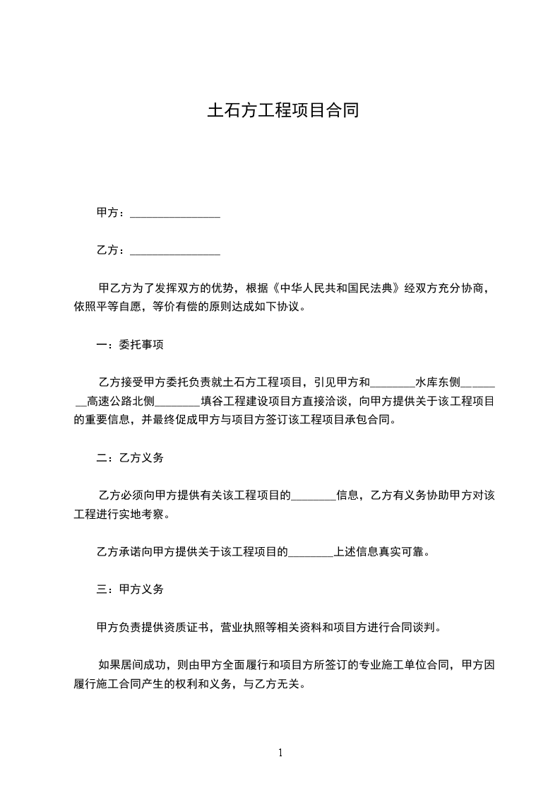 乙方接受甲方委托负责就土石方工程项目,引见甲方和________水库东侧________高速公路北侧________填谷工程建设项目方直接洽谈,向甲方提供关于该工程项目的重要信息,并最终促成甲方与项目方签订该工程项目承包合同。