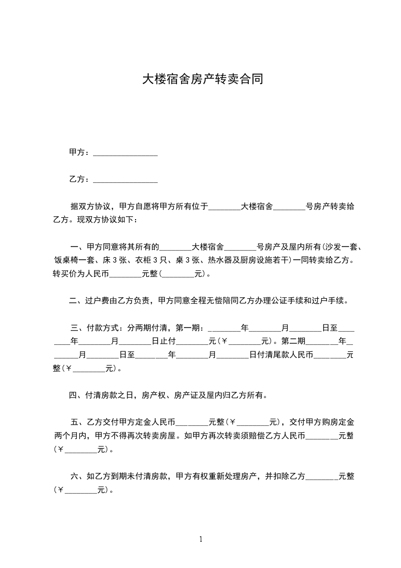 一、甲方同意将其所有的________大楼宿舍________号房产及屋内所有(沙发一套、饭桌椅一套、床3张、衣柜3只、桌3张、热水器及厨房设施若干)一同转卖给乙方。转买价为人民币________元整(________元)。